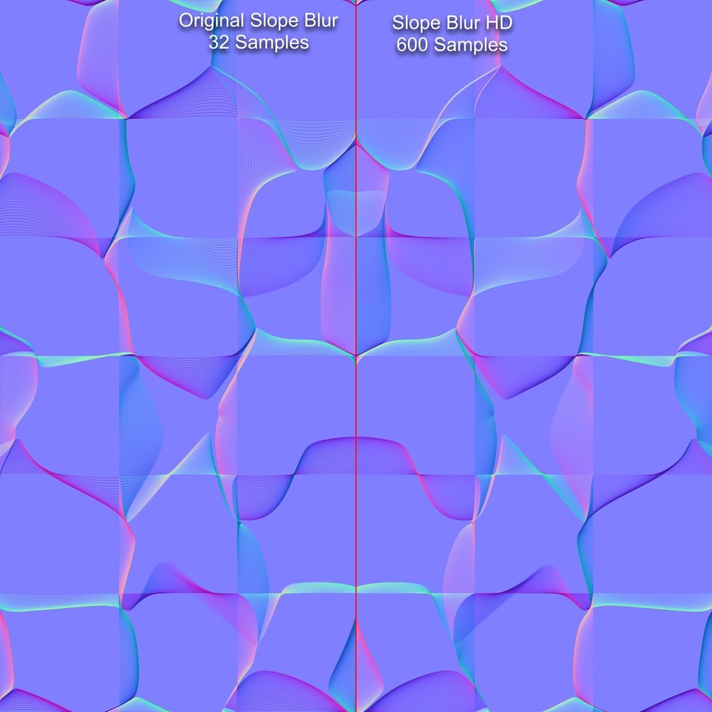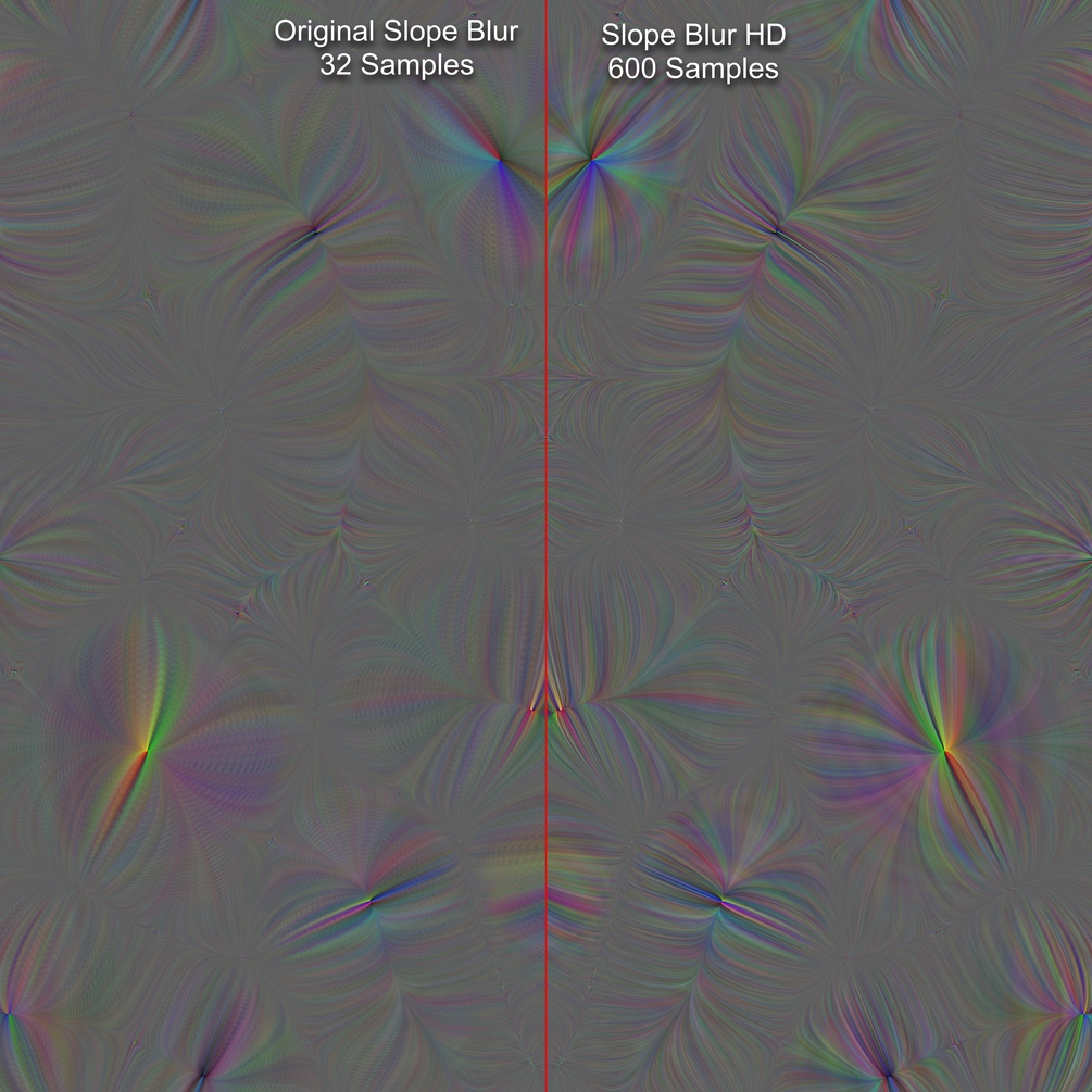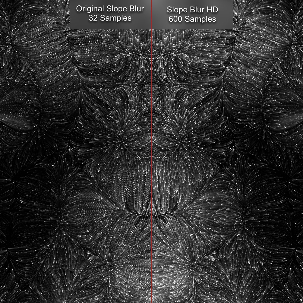Custom Slope Blur built from the ground up with pixel processor and while loops. Samples can now go beyond 32 to a maximum of 99999 (not recommended, usually a few hundred samples is more than enough). Regular Slope Blur subtly blurs the distorted image as samples increase, Slope Blur HD retains texture sharpness for each sample. If the blurring effect is something you need, please use regular Slope Blur nodes instead of Slope Blur HD.